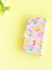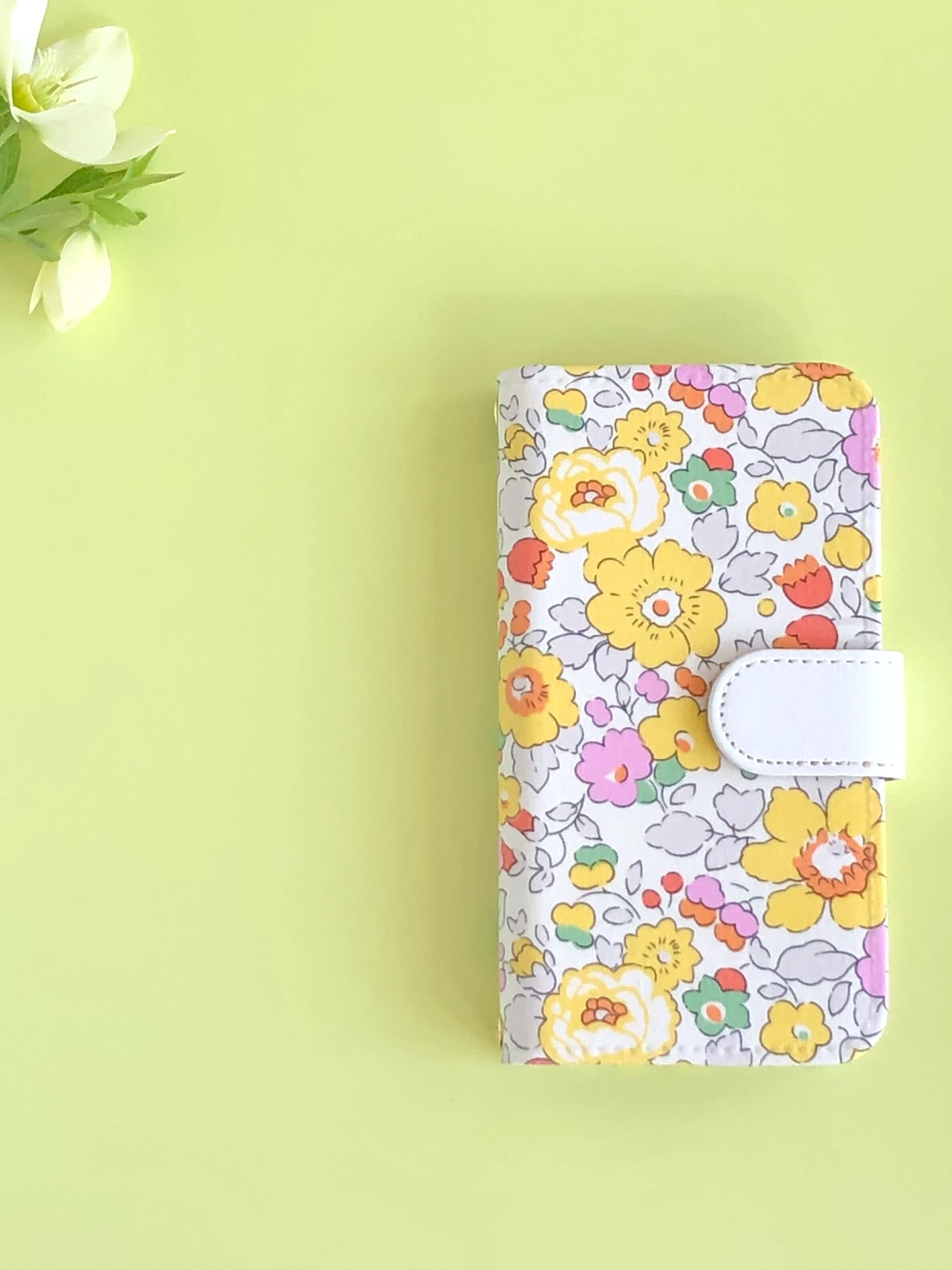 リバティ生地を表紙にあつらえた、手帳型 iphone7,8,SE2,SE3 ケース(ベッツィY)です。