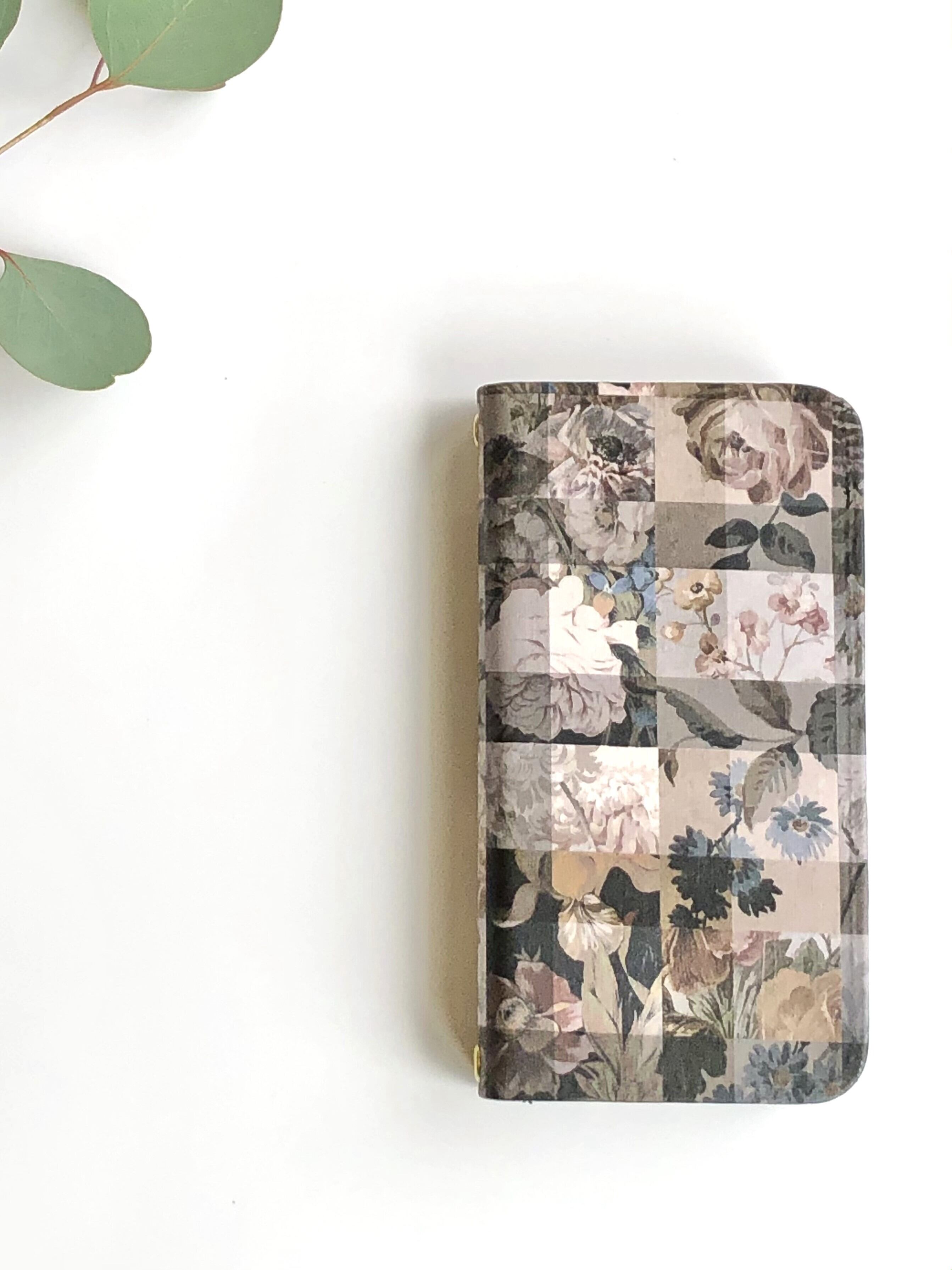 リバティを贅沢に表紙にあつらえた、手帳型iphone7.8.SE2.SE3 ケース (アーカイブg)。ベルト無しタイプとなります。